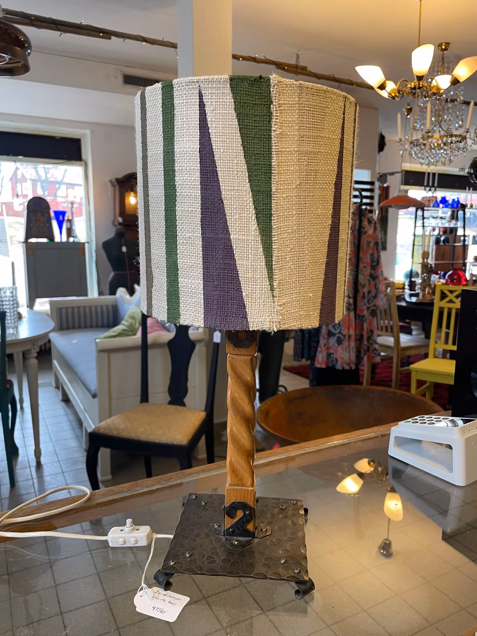 Fin bordslamp i trä och smide. 49 cm hög inkl. Skärm.