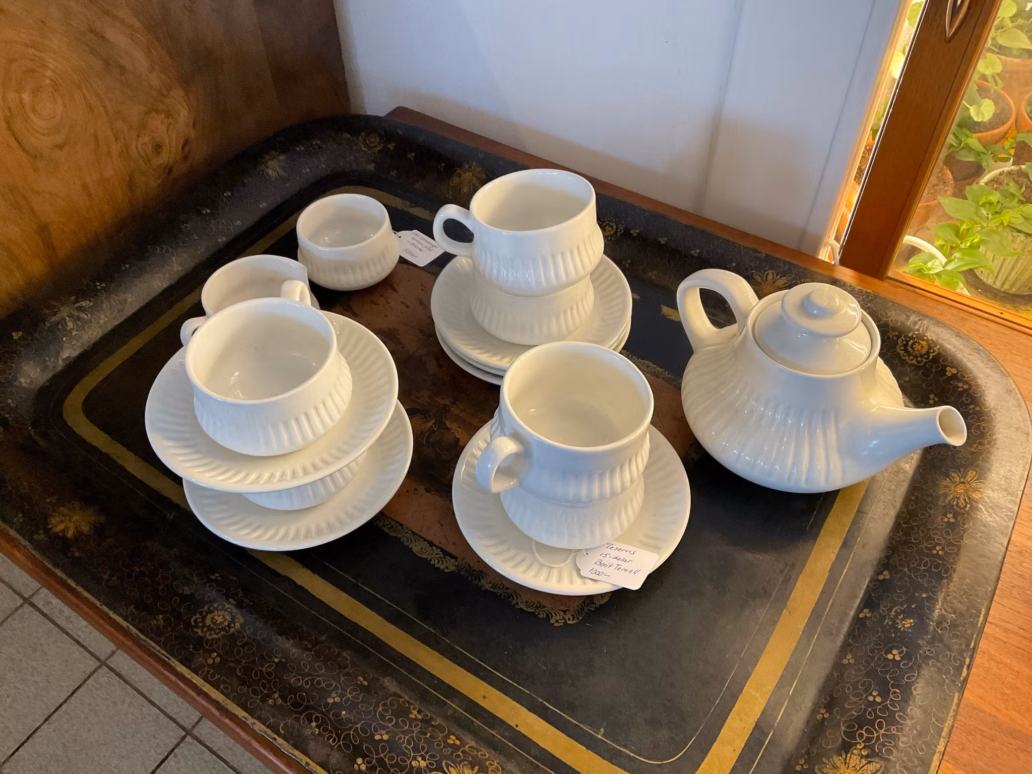 6 koppar med fat, tekanna, sockerskål och gräddkanna.