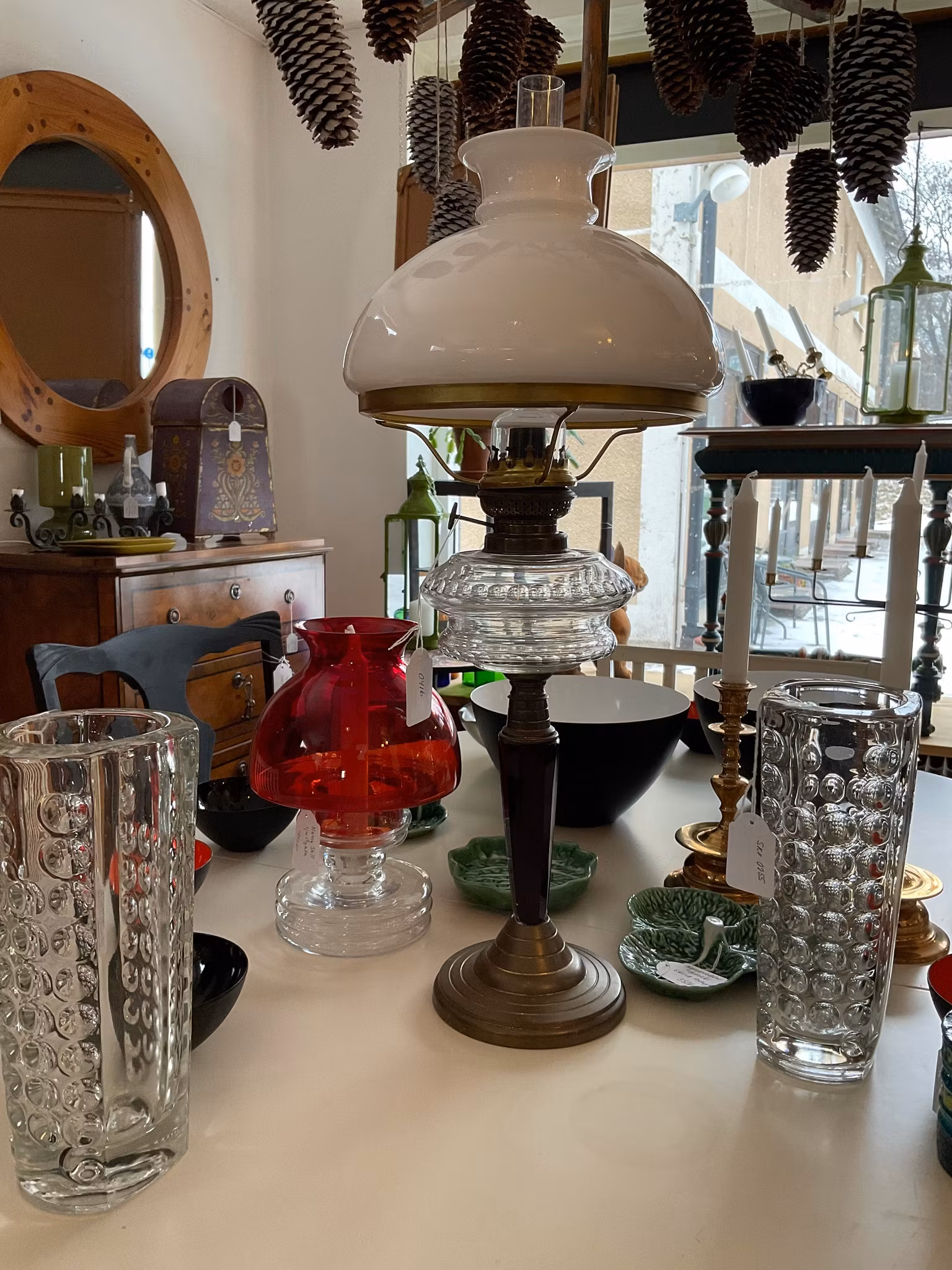 Stor och fin fotogenlampa, totalhöjd ca 65 cm inkl rökrör. Mässing och glas. Märkt Karlskrona lampfabrik