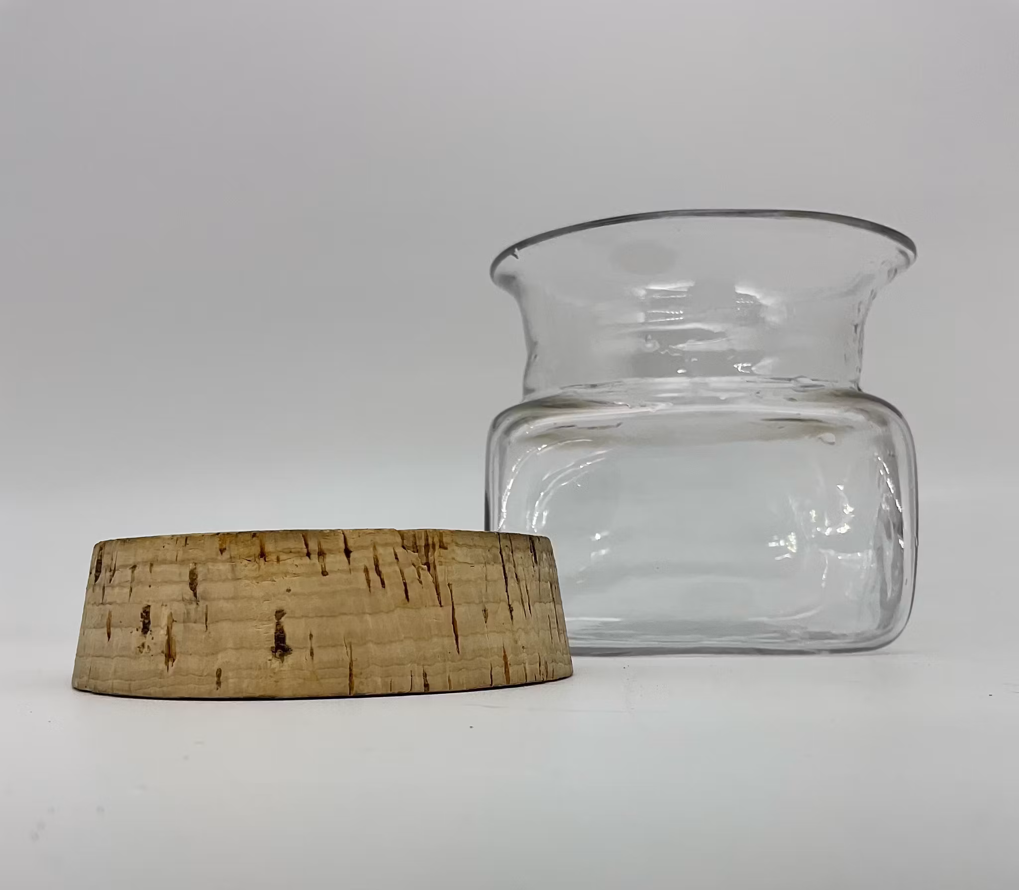 Glasburk med lock av kork, sill i kvadrat. Ca 11 cm hög.
